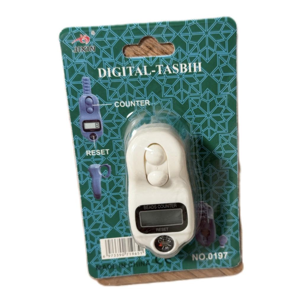 تسبيح إلكتروني أبيض صغير بشاشة LCD وبوصلة مدمجة، أزرار مغناطيسية للعد الدقيق حتى 99، مع Reset وMode، في تعبئة خضراء إسلامية أنيقة. مثالي للذكر اليومي، خفيف ومحمول كهدية روحانية.
