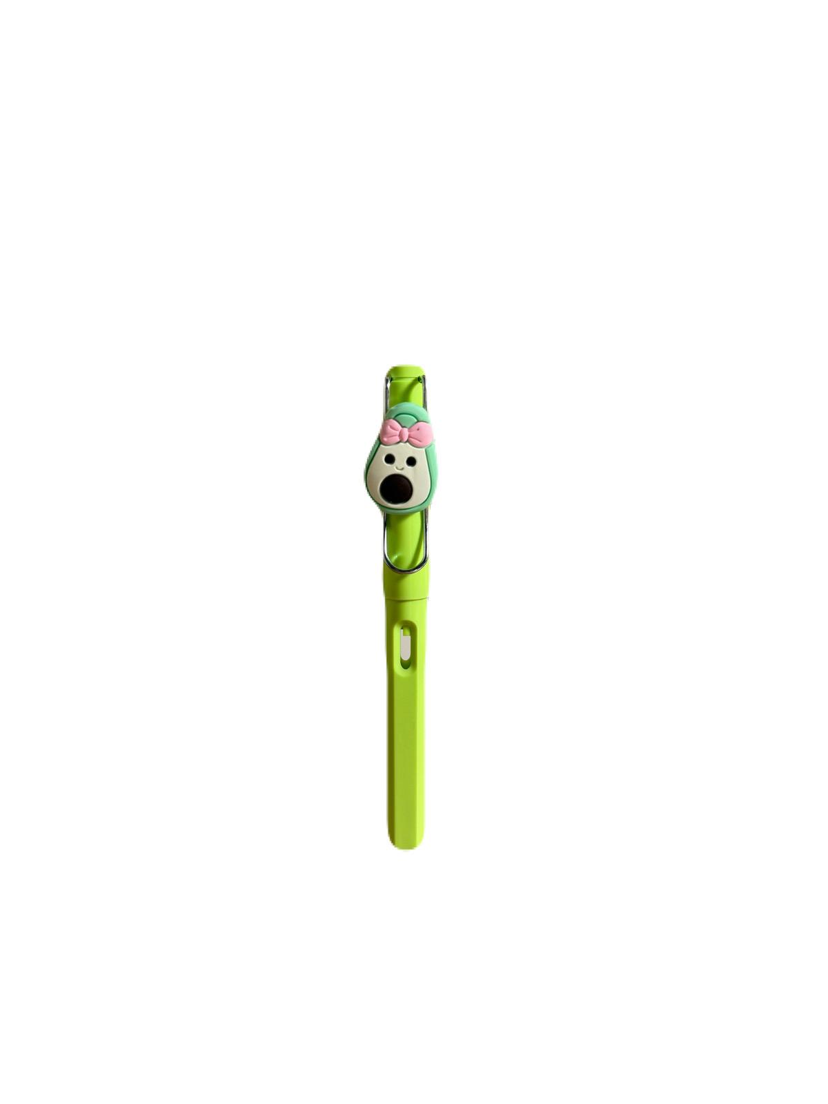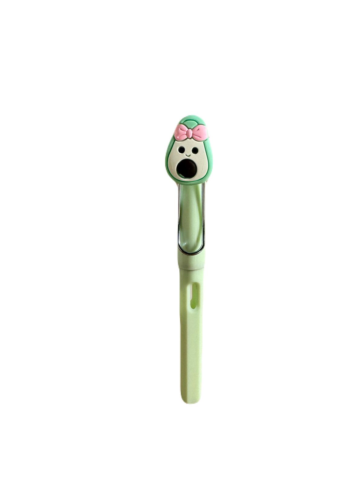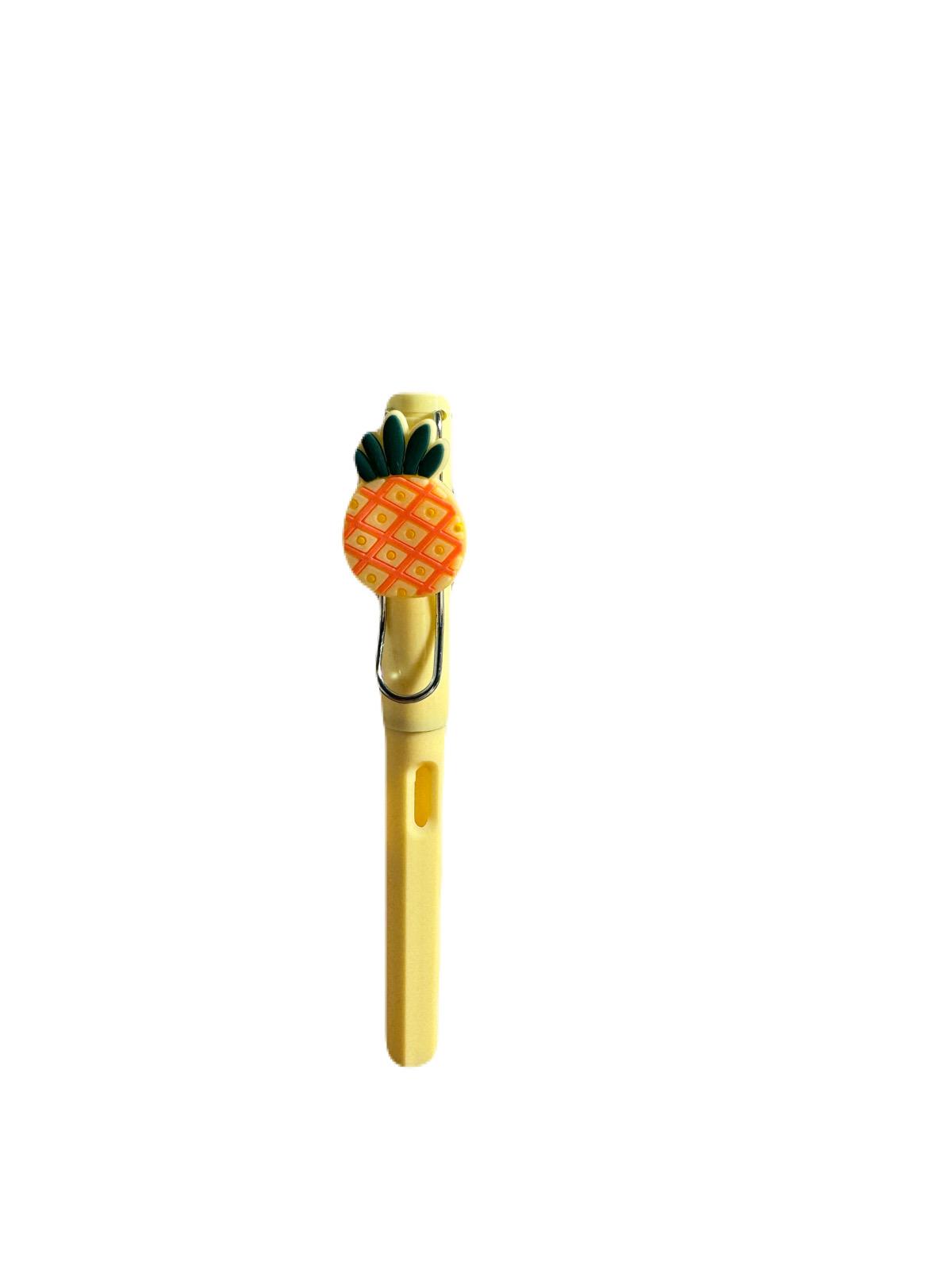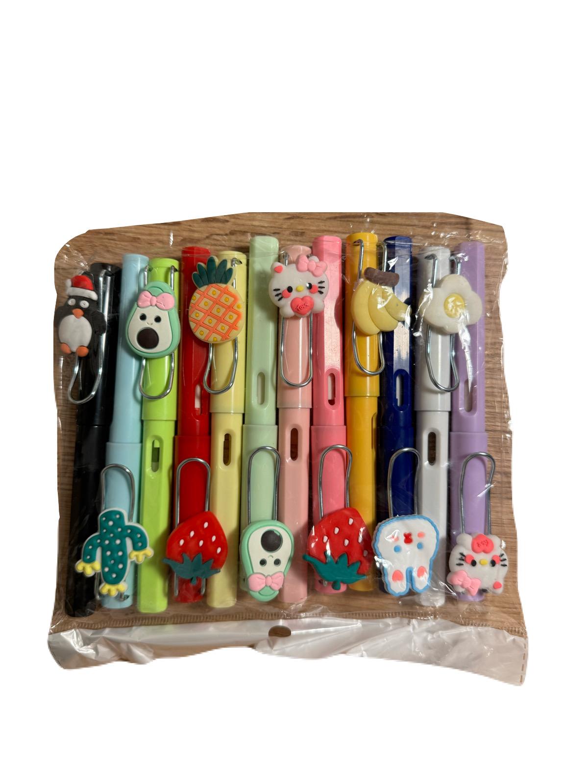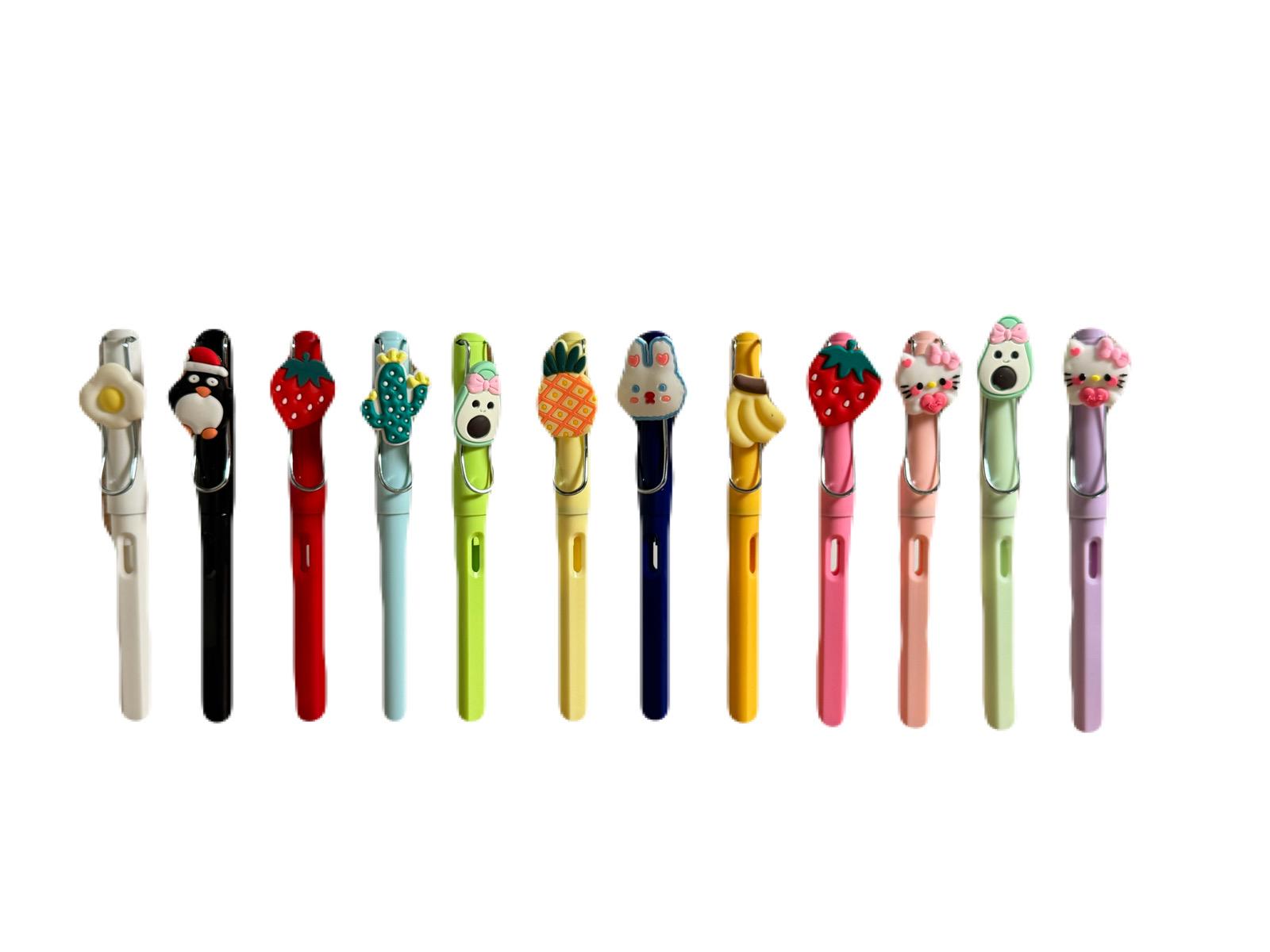 • التصميم: كل قلم مزوّد بمشبك معدني يحمل زينة مطاطية كرتونية تضم فواكه وشخصيات لطيفة (أفوكادو، فراولة، باندا، قطة، موزة، صبار، إلخ).