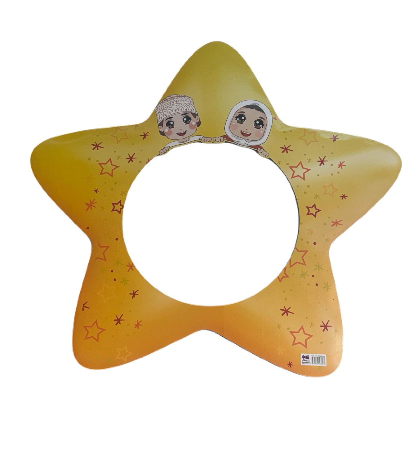 إطار ديكوري على شكل نجمة بتصميم لطيف وألوان دافئة، مزخرف برسومات نجوم وشخصيات كرتونية محببة. يتميز بفتحة دائرية في المنتصف تتيح وضع صورة، مرآة، أو استخدامه كإطار تفاعلي للتصوير والأنشطة.