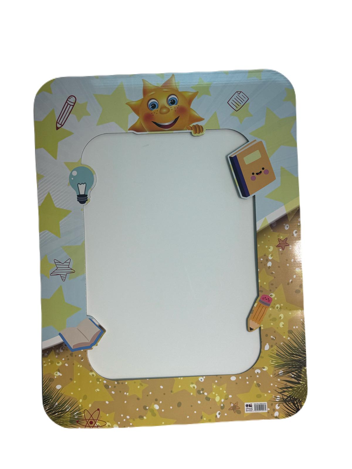 إطار ديكوري وتعليمي بتصميم طفولي جذاب وألوان مبهجة، مزين برسومات تعليمية محببة مثل الشمس والكتب والأقلام والنجوم. يتميز بفتحة فارغة من الوسط تتيح استخدامه لعرض الصور، كتابة العبارات، الأنشطة التعليمية، أو كلوحة تفاعلية للأطفال.
