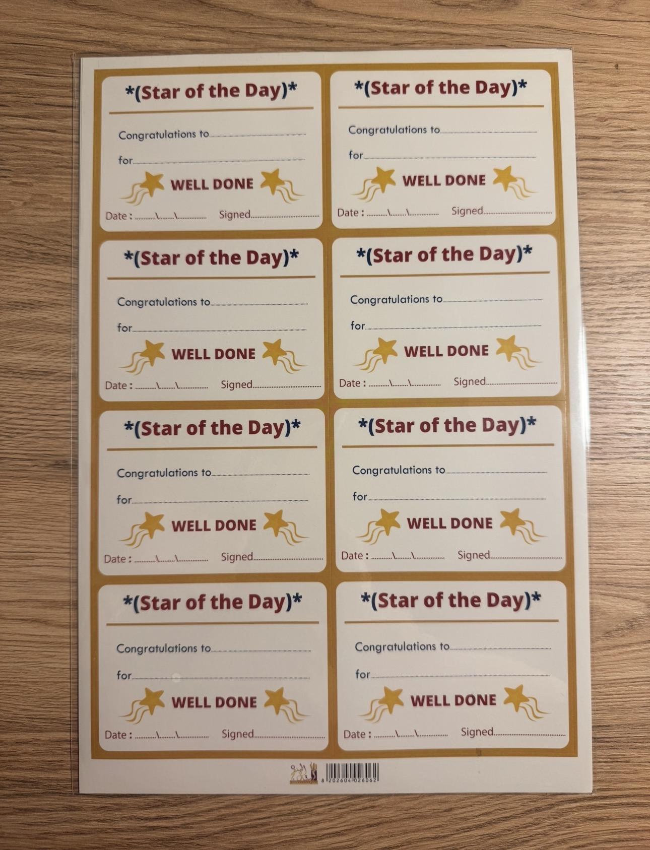 •بطاقات شهادة “Star of the Day” ملوّنة وجاهزة للكتابة، مثالية لمكافأة الطالب المميّز خلال اليوم وتشجيع السلوك الإيجابي في الصف أو المنزل.