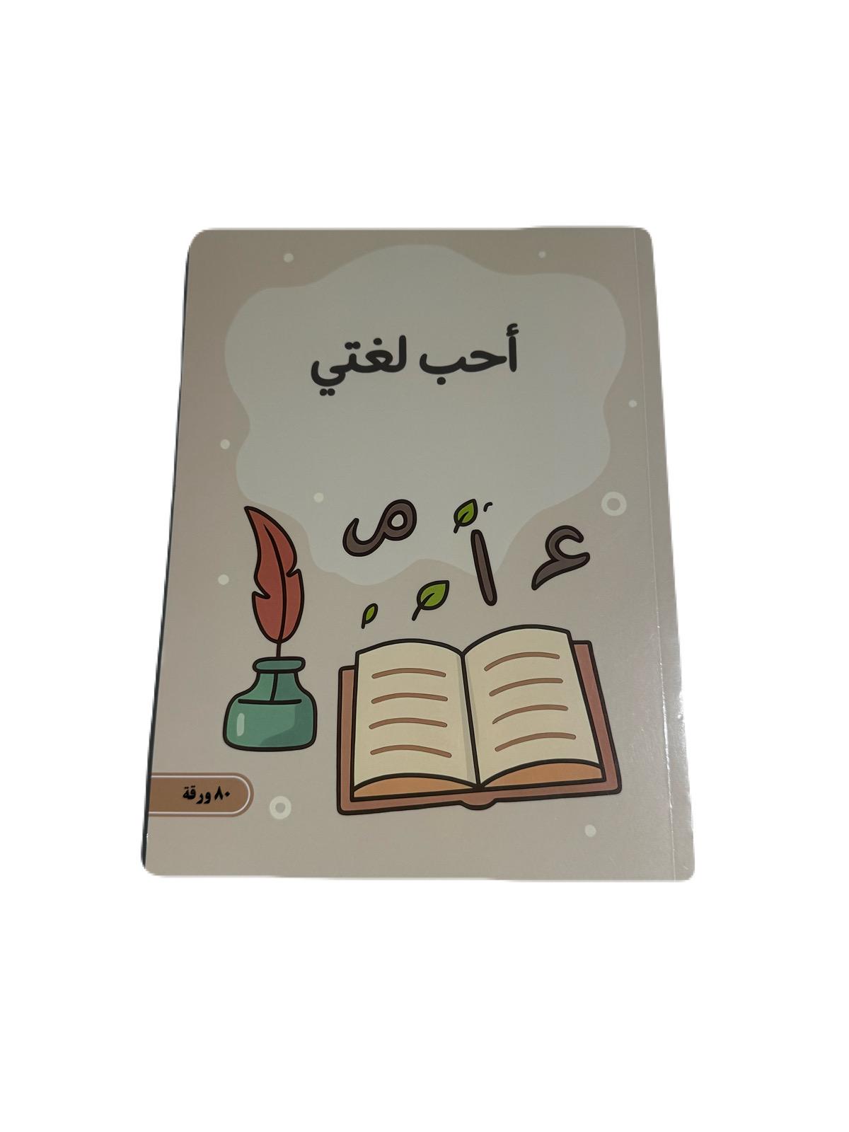 •تصميم داخلي ملوَّن برسومات كتاب وكلمة “أحب لغتي” في الأسفل يمنح الطالب حافزًا بصريًا للاستمرار في الكتابة.