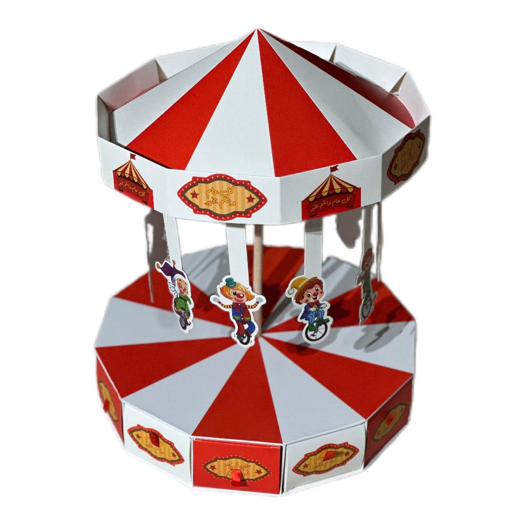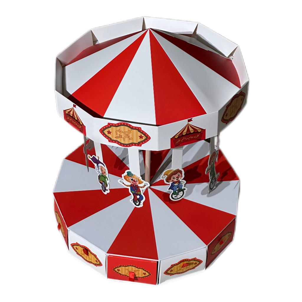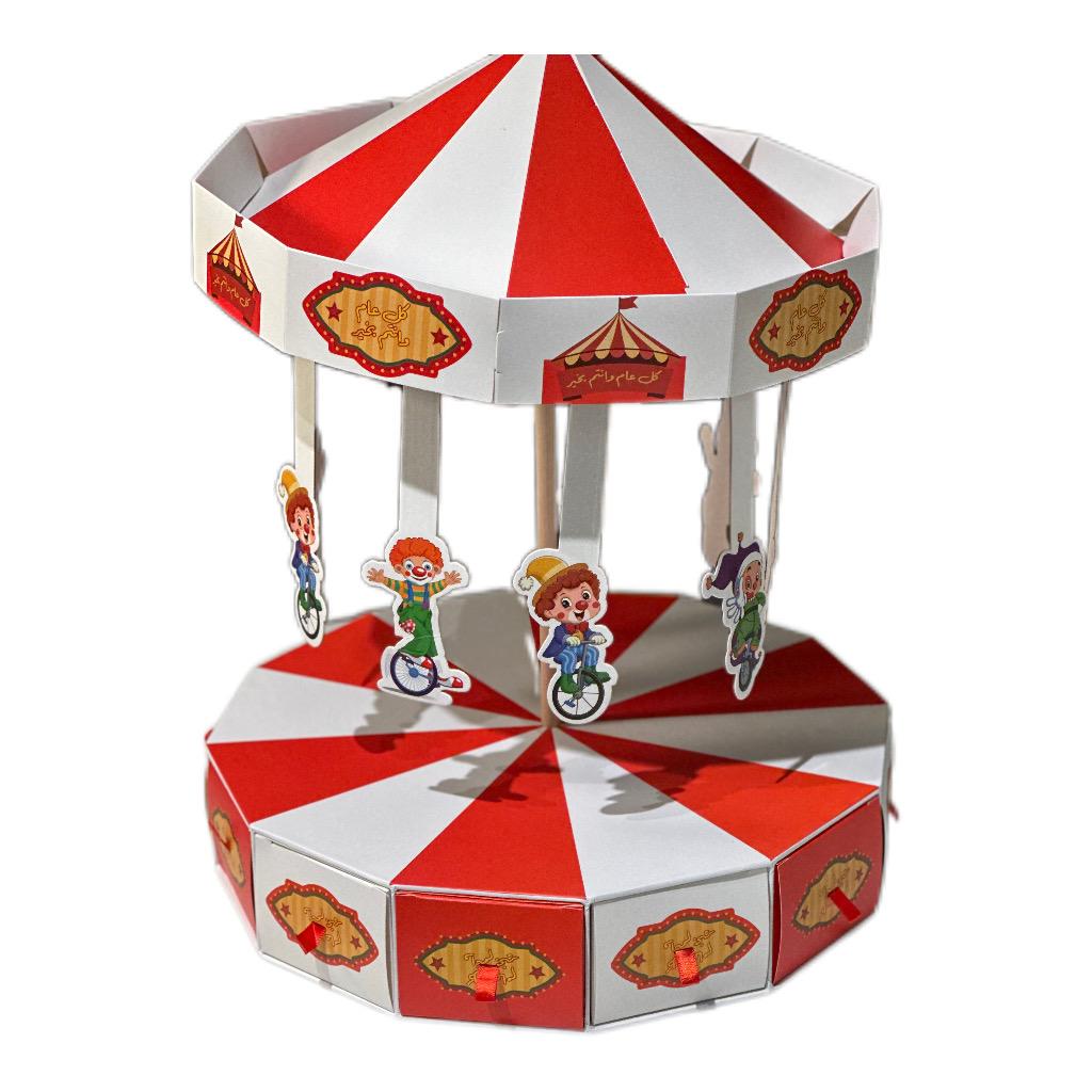 توزيعة عيد مميزة بتصميم الكاروسيل الدوّار تضيف أجواء فرح ومرح على احتفالات العيد. يتميز التصميم بألوانه الزاهية وشخصيات الأطفال اللطيفة المعلّقة التي تعطي شكلًا جميلًا وجذابًا، مع عبارة “كل عام وأنتم بخير” المطبوعة على الصناديق لتجعلها مناسبة خصيصًا لعيد الفطر أو عيد الأضحى.