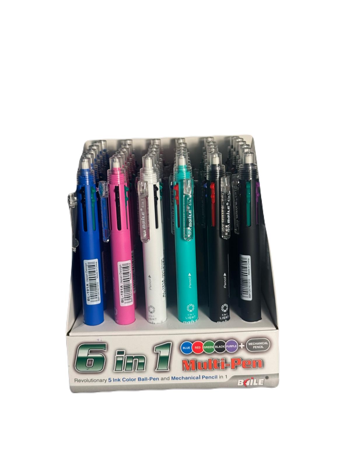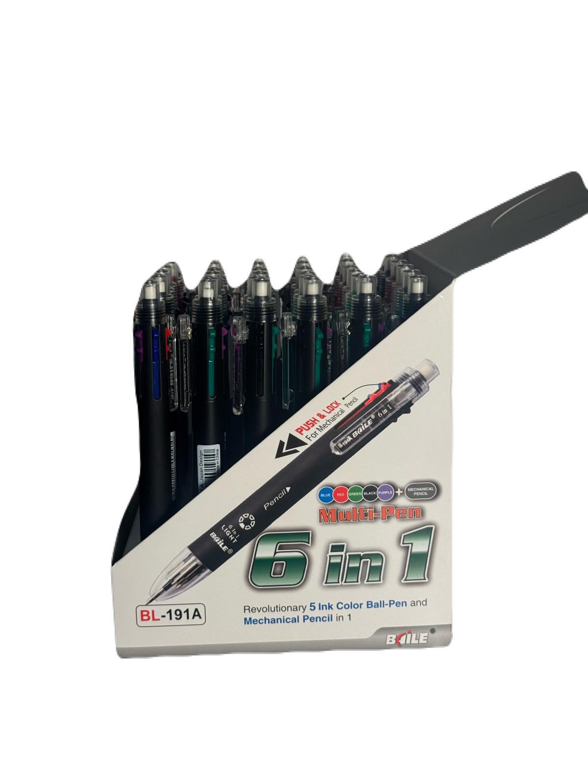 قلم عملي يجمع بين 5 ألوان حبر مختلفة (أزرق، أحمر، أخضر، أسود، بنفسجي) بالإضافة إلى قلم رصاص ميكانيكي في قلم واحد. تصميم أنيق وسهل الاستخدام بزرّات اختيار سريعة لكل لون، مثالي للطلاب، المكاتب، والمعلمين. يوفّر الوقت والمساحة ويغني عن حمل عدة أقلام. جودة كتابة سلسة وثابتة مع جسم مريح لليد، مناسب للاستخدام اليومي والتنظيم والترميز اللوني.