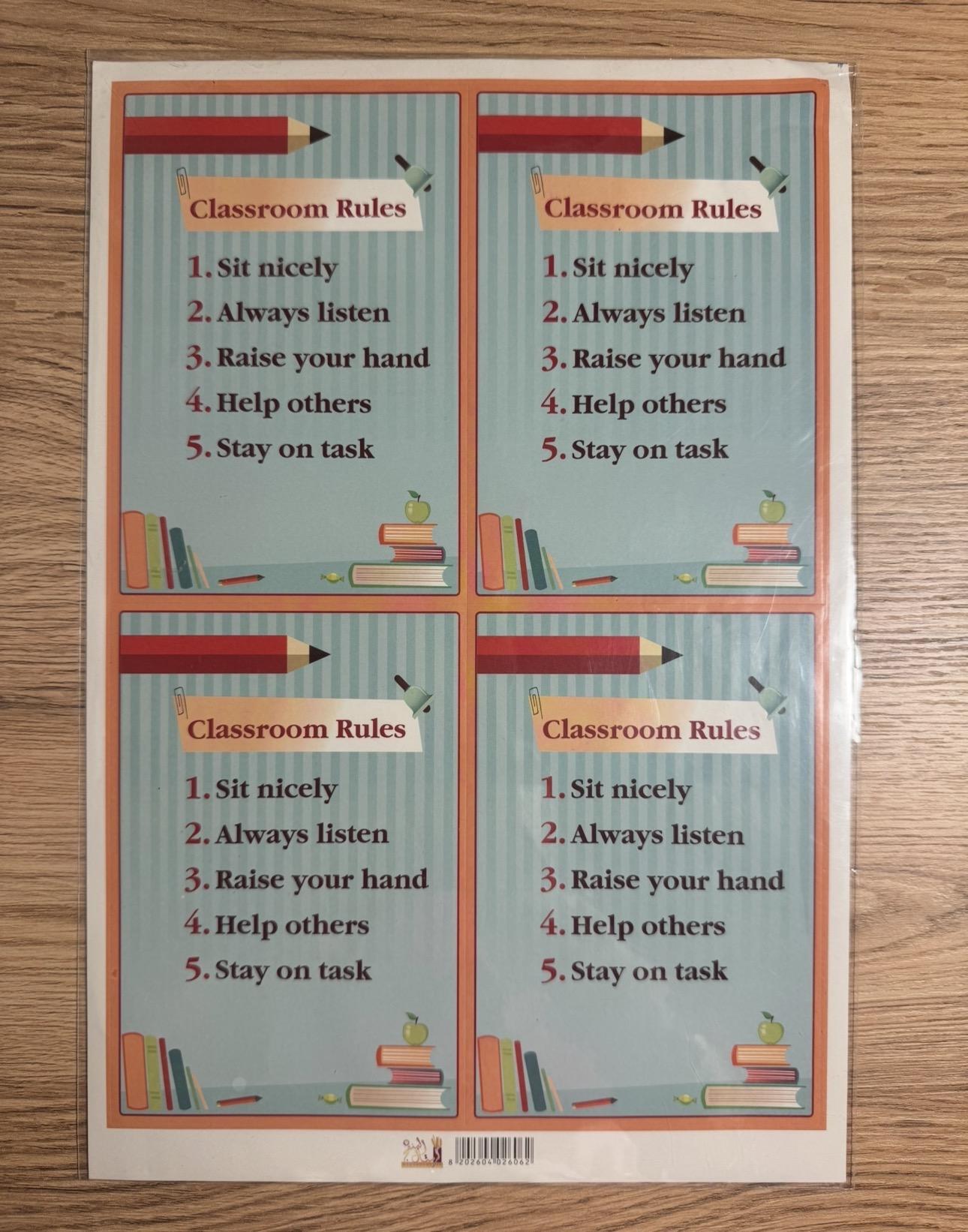 •ملصقات قواعد صف ملونة تحتوي على قواعد أساسية مثل “الاستمع بانتباه” (Listen Nicely)، “ارفع يدك” (Raise Your Hand)، “ساعد الآخرين” (Help Others)، مثالية للفصول لتعليم السلوك الإيجابي بوضوح.