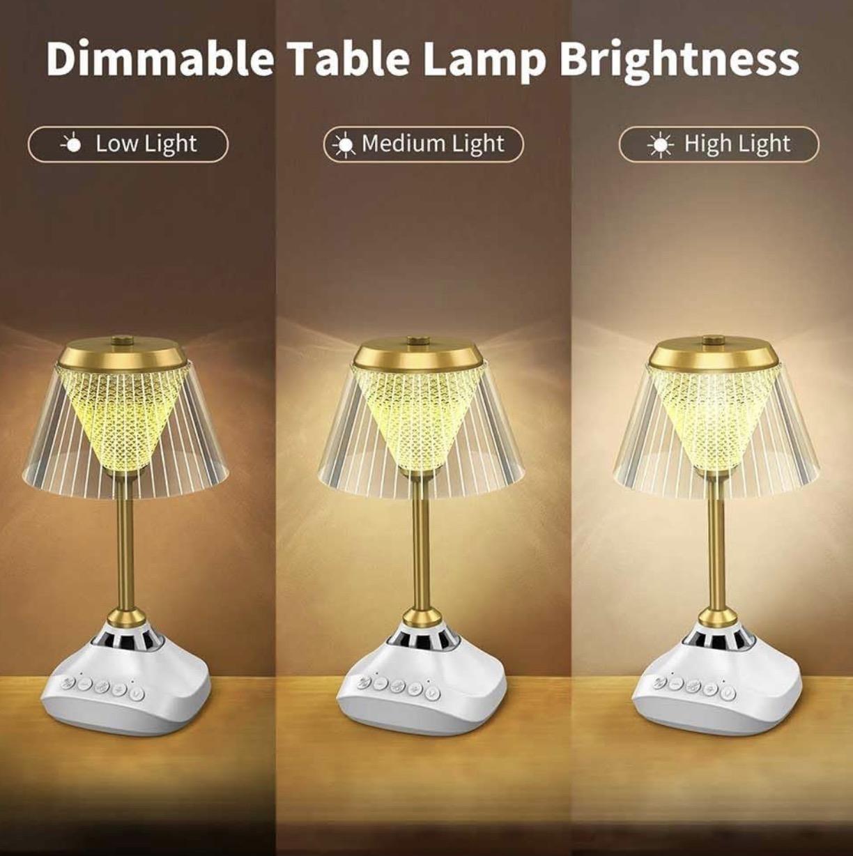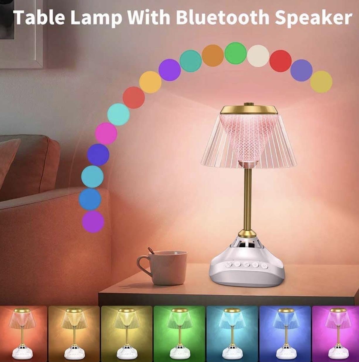 مصباح مكتبي أنيق متعدد الألوان بإضاءة LED قابلة للتعديل، مزود بسماعة بلوتوث عالية الوضوح لتشغيل القرآن الكريم والأذكار من الجوال، مع أزرار تحكم سهلة وسلك شحن USB لاستخدامه في غرفة النوم أو زاوية الصلاة.