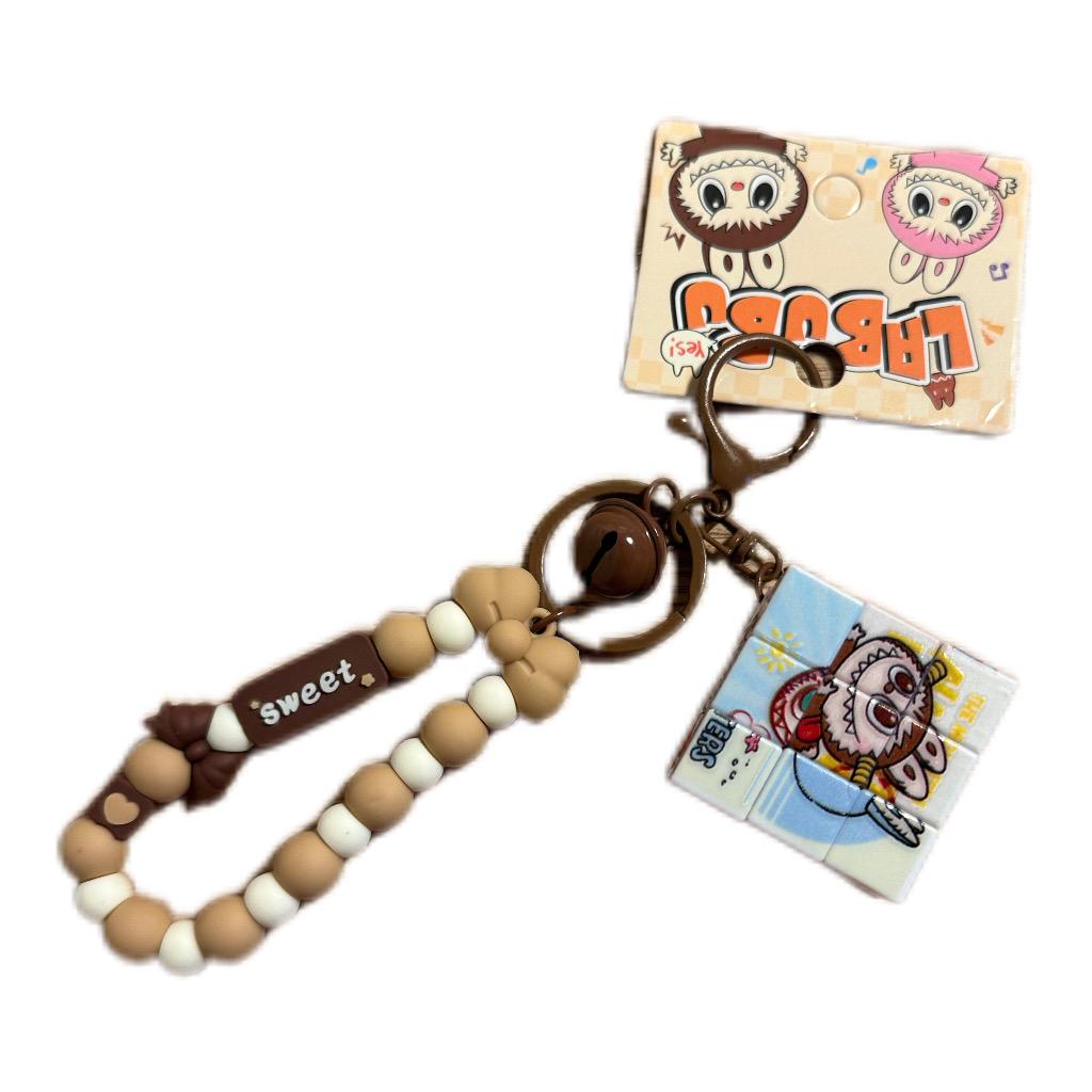 ميدالية بسوار خرز بدرجات البيج مع جرس معدني، تحمل مكعب لغز متحرك يتكوّن من أشكال مختلفة عند اللعب به مع رسمة قط ظريف بقبعة كاوبوي ورسومات مرحة، تناسب الشخصيات الحيوية وتضيف طابعًا مميزًا ومرحًا للمفاتيح أو حقيبة اليد.