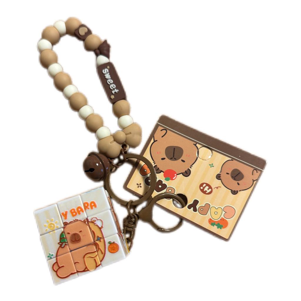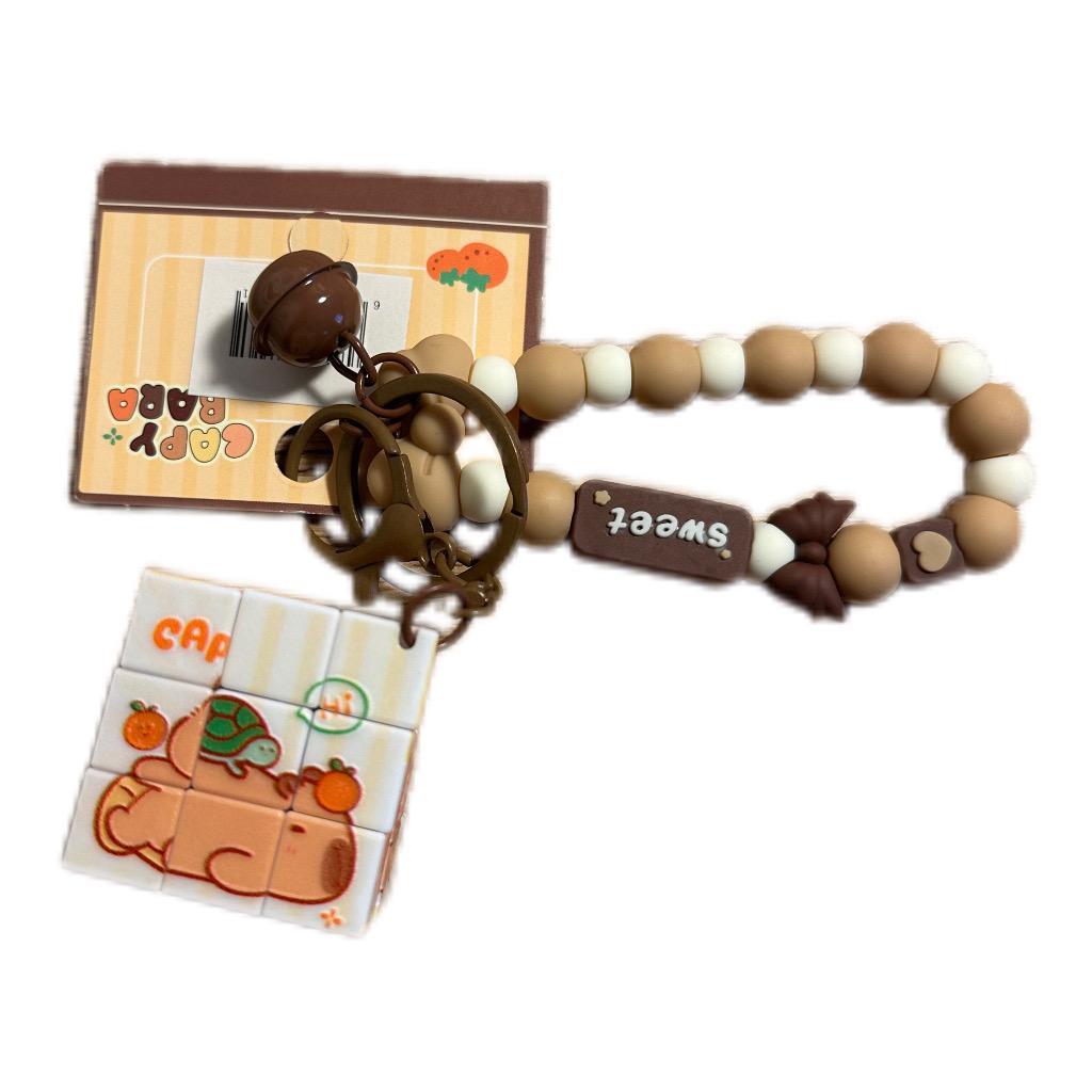 ميدالية مفاتيح بسوار خرز بيج وكريمي مع قطعة مكتوب عليها “sweet” وجرس صغير، يتدلى منها مكعب لغز متحرك يمكن تشكيله بعدة أوضاع برسمة دب لطيف بألوان دافئة وتفاصيل فواكه، مثالية لعشّاق الشخصيات الكيوت وإضافة لمسة ناعمة للشنطة أو المفاتيح.