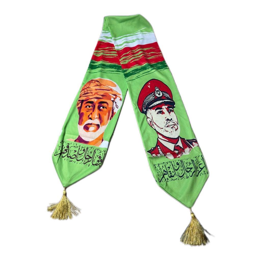 وشاح أخضر مزين برسومات وشعار سلطنة عمان مع زخارف عربية وإضافات باللون الأحمر والأبيض.