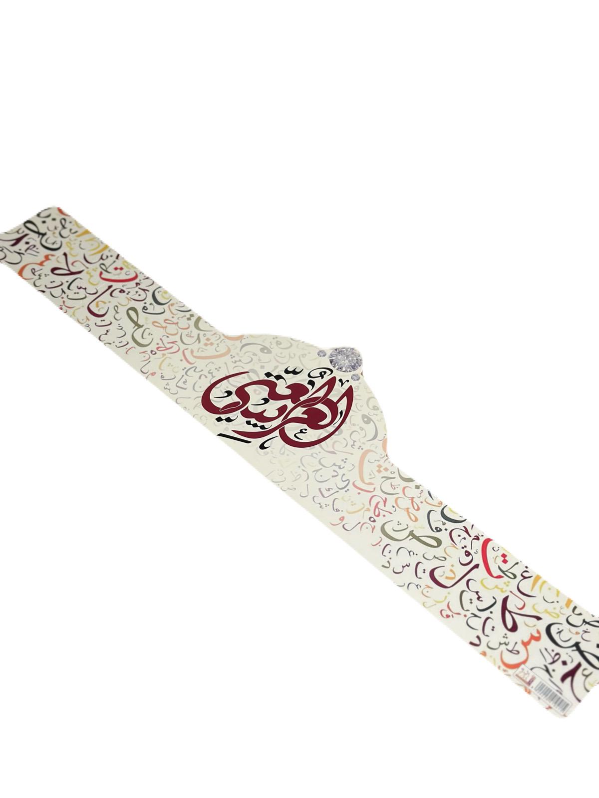 تاج مستطيل بطول الرأس بالكامل بلون عاجي مزخرف بحروف عربية صغيرة ملونة موزعة عشوائياً في الخلفية، تتوسطه دائرة علوية فيها عبارة بخط عربي عريض باللون العنابي مع تدرجات وخطوط سوداء تعطيه بروزاً، مع خط طيّ وخانات قياس لتثبيته حول الرأس.
