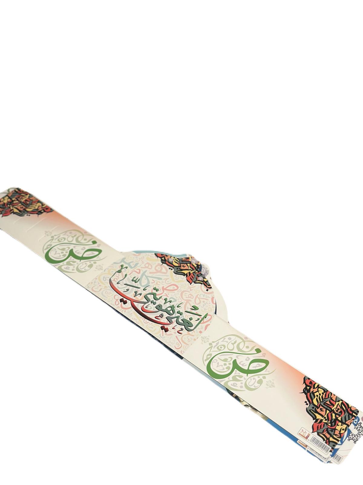تاج بخلفية كريمية تتوزع عليها لوحات صغيرة بزخارف كوفية وألوان دافئة عند الجانبين، في الوسط إطار مستدير يحتوي على عبارة عربية بخط أخضر ومرسوم حولها زخرف عربي حديث، ويظهر في الطرفين نفس الرمز الكتابي باللون الأخضر، مع أماكن محددة للقص والتركيب.