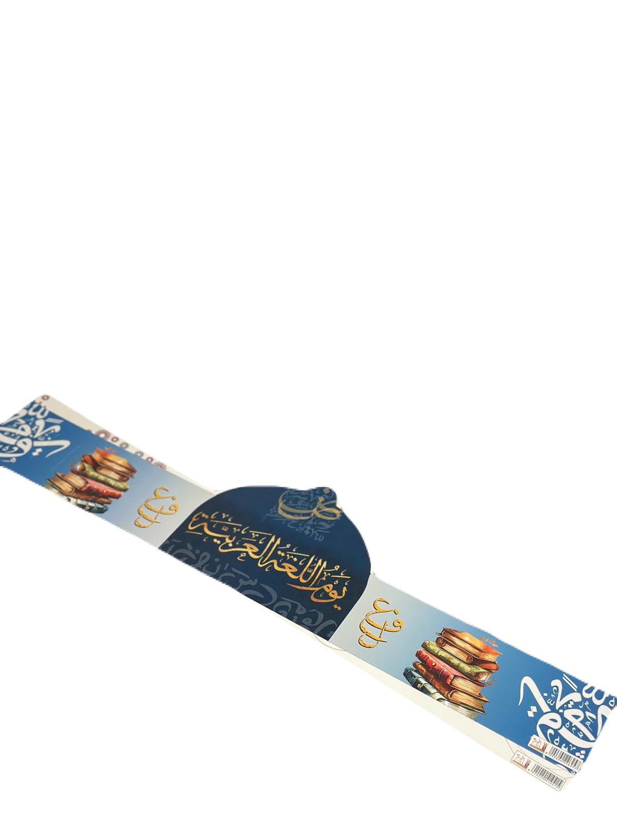 تاج ذو خلفية متدرجة من الأزرق الفاتح إلى الأزرق الداكن في المركز، تتوسط الجزء العلوي قُبّة شبه دائرية مكتوب عليها شعار بخط عربي ذهبي، وعلى الجانبين رسمة رزمة كتب ملونة ولفظ عربي مكرر بخط ذهبي، مع شريط جانبي مستقيم يلتف حول الرأس ومقسّم بدرجات للطول.